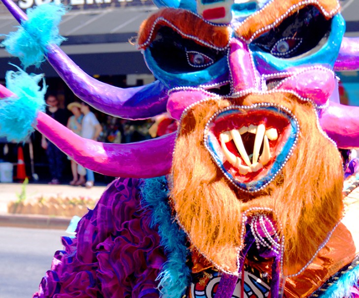 Twirling carnival characters via Union Carnavalesca de N.Y. and Grupo de Lechones Los Faraones de Santiago transformed Graham Avenue into the inner workings of a giant kaleidoscope. Among the characters spotted were: a Roba la Gallina (chicken robber) a parasol carrying vision in blue, white, and red with the telltale excessively padded rear and breasts; several Diablo Cojuelos (devil who walks with a limp) multi-horned, sharp toothed beings with very elaborate masks and comic bad attitudes; many Lechones (pork eaters) they wear duck-billed masks with big horns and carry a whip (other of the characters also carried whips); and Pepines who also have duck-billed masks but their horns are wider and look more horseshoe shaped. In addition to the whips, many of the characters brandished vejigas, balloon-like orbs filled with air reportedly used as crowd control weapon if people get too close. Although getting hit with vejigas can hurt, it is said this brings good luck. No hitting with vejigas was observed by this reporter.