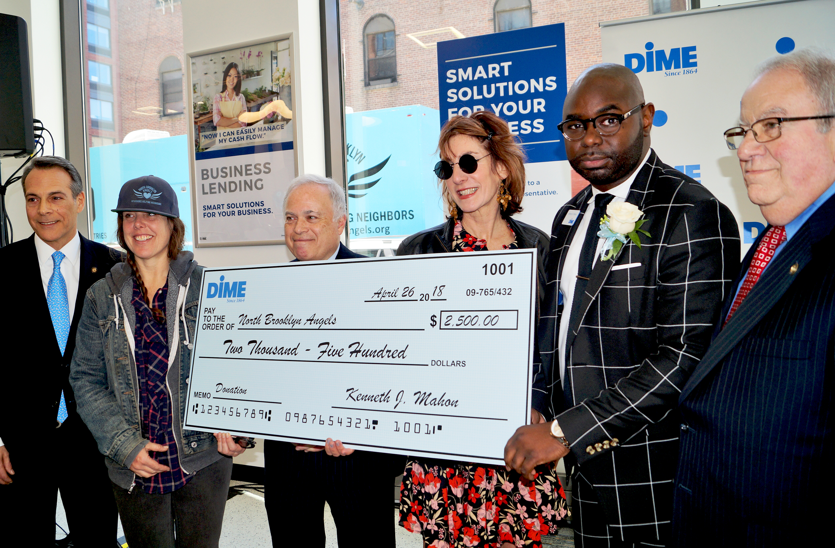 (l to r) Michael A. Perez, Dime EVP and Chief Retail Officer; Ryan Kuonen, North Brooklyn Angels Executive Director; Kenneth J. Mahon, Dime President and Chief Executive Officer; Felice Kirby, North Brooklyn Angels Special Projects Director; Anthony Wilson, Dime Kent Avenue Branch Manager; and Vincent F. Palagiano, Dime Chairman
