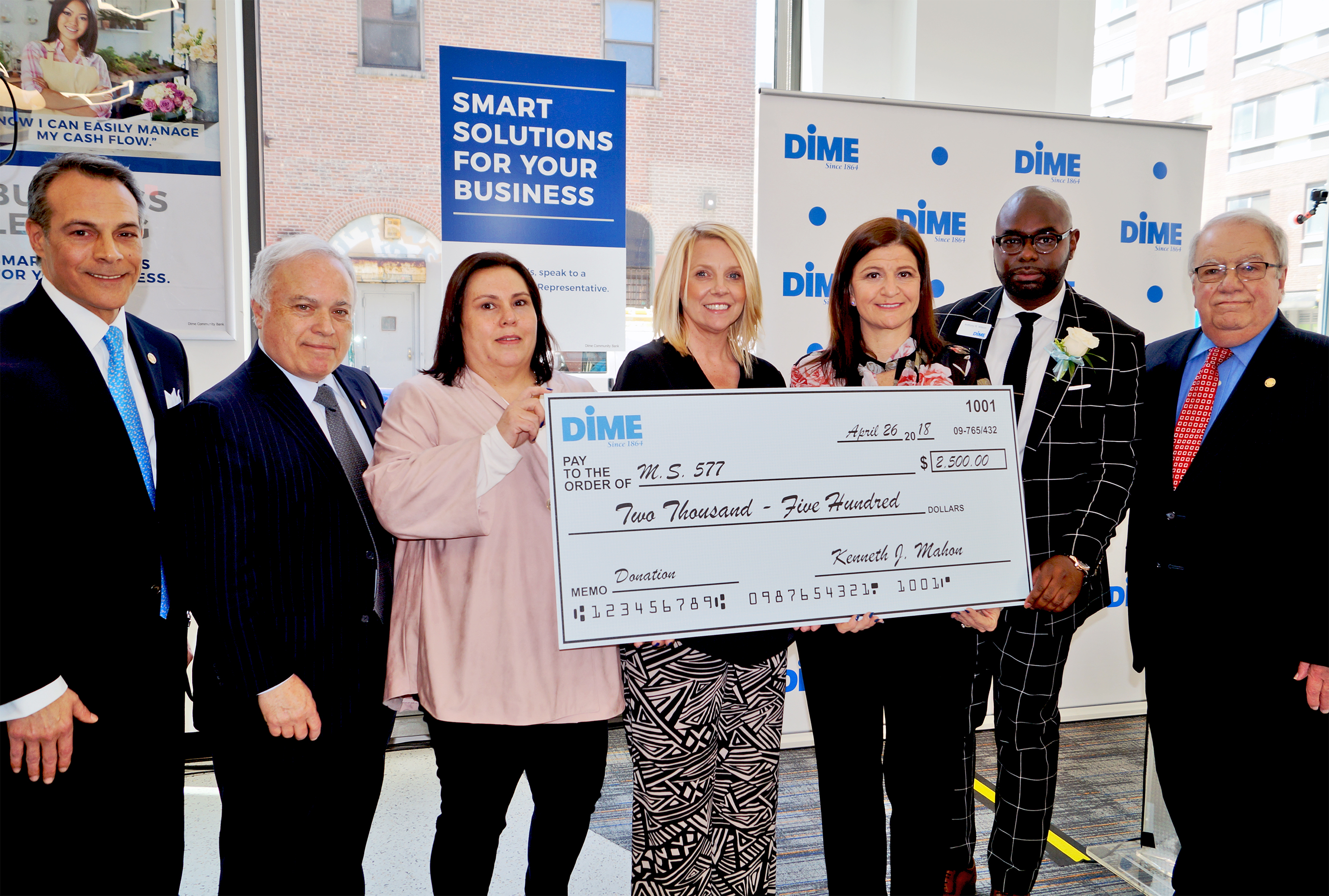 (l to r) Michael A. Perez, Dime EVP and Chief Retail Officer; Ryan Kuonen, North Brooklyn Angels Executive Director; Kenneth J. Mahon, Dime President and Chief Executive Officer; Felice Kirby, North Brooklyn Angels Special Projects Director; Anthony Wilson, Dime Kent Avenue Branch Manager; and Vincent F. Palagiano, Dime Chairman