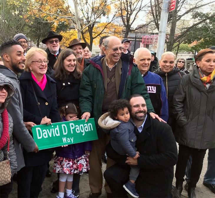 South 4th Street and Roebling has been named David D. Pagán Way in honor of Southside United HDFC–Los Sures’s original Executive Director. During David Pagán’s leadership, Los Sures rehabilitated over 4,000 affordable housing units, expanded its senior center, and the range of services the organization offers. David D. Pagán Way is where Los Sures’s David Santiago Senior Center is located. Present at the naming ceremony were: Congresswoman Nydia Velázquez, Assemblyman Joseph Lentol, Assemblywoman Maritza Davila, Council Member Antonio Reynoso, Barbara Schliff (Los Sures), Martin Needelman (Brooklyn Legal Services Corporation A), Michael Rochford (St. Nicks Alliance), Diana Reyna, and Rabbi David Neiderman.