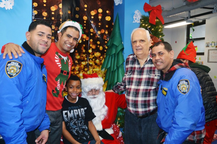 For weeks, the neighborhood schools, local NYPD precincts, FDNY, and others have been collecting toys for the annual Christmas in Williamsburg toy drive. On December 15th Santa’s elves from Grand Street Campus, NYPD Explorers, NYCHA Resident Associations help distribute the collection throughout local NYCHA houses. Pictured NYPD officer Melendez (left), District Leader Tommy Torres (2nd from left), Santa (center), Assemblyman Joseph Lentol (2nd from right) and NYPD officer Ro (right) Photo Credit: Tommy Torres
