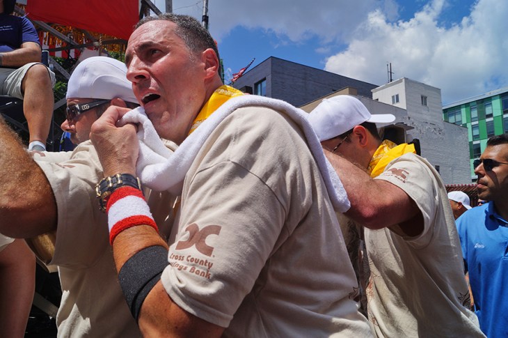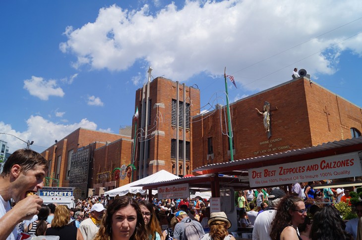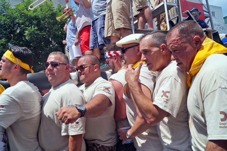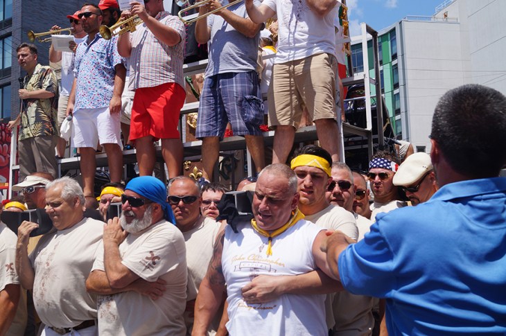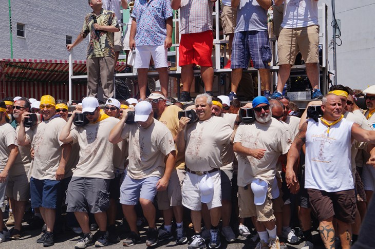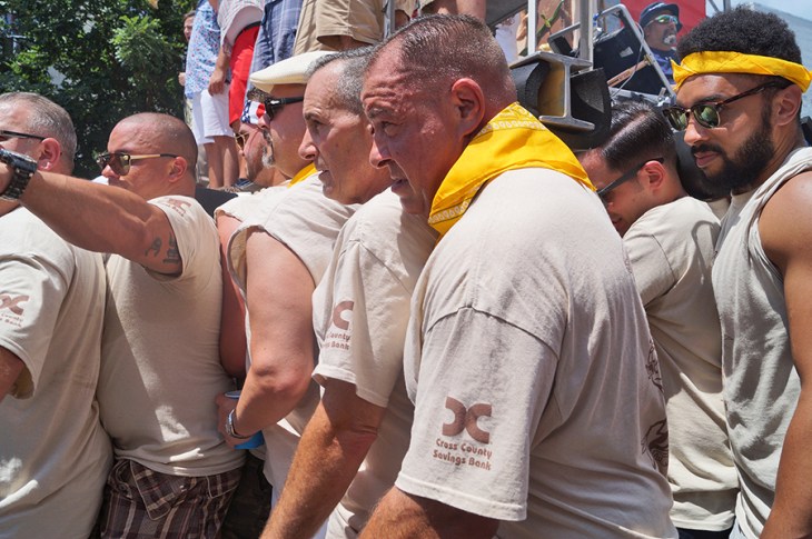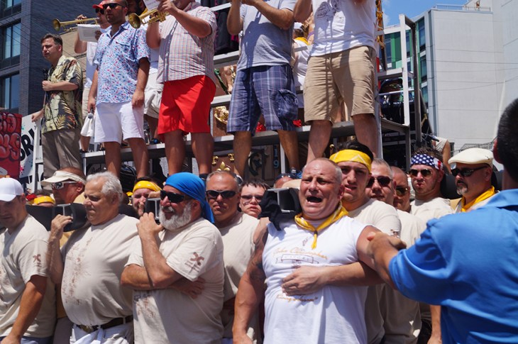 In addition to the above average temperatures, there was another challenge that needed to be overcome before the feast began. For the first time a call went out for volunteer lifters. Due to the neighborhood’s changing demographics the Italian percentage of the community is decreasing. Happily Williamsburg answered the call, and the added new blood diversity plus those who grew up here and moved away that joined the lift brought the tangible angle to the lesson: together we can move mountains.