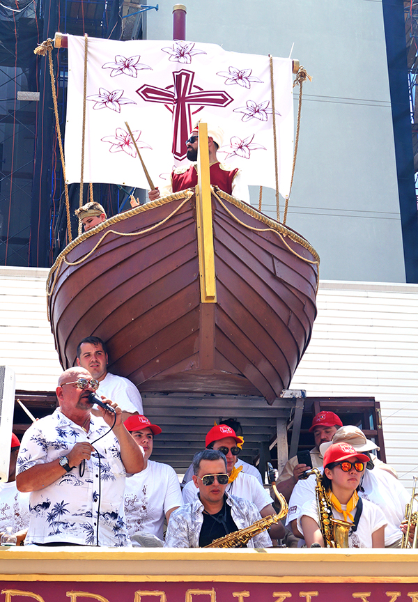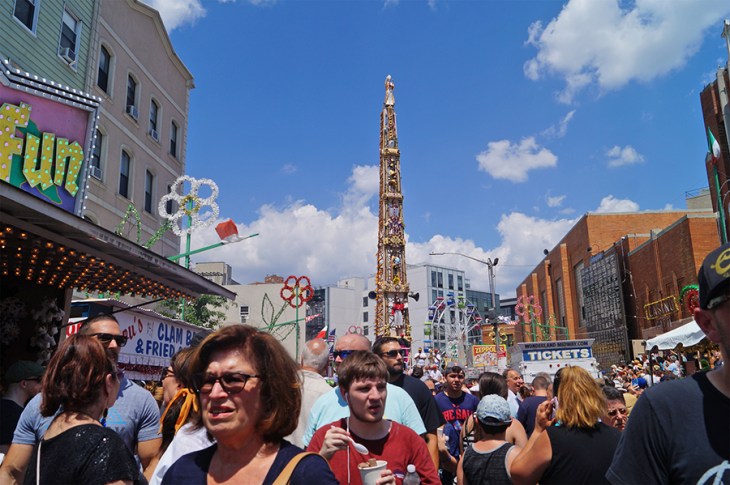 However, sweltering heat can’t put a damper on the spirit of those who lift the Giglio physically and figuratively. From July 10–21, the Our Lady of Mount Carmel Feast, familiarly known as the Giglio, as usual filled Havemeyer St. from North 6th to Withers Sts. plus the side streets on both sides with vendors, rides, and games. Tradition and the love of community and church are what fuel those who participate in this feast, which began here in 1903 by immigrants from Nola, Italy who wanted to recreate a tradition from their old world in their new home. Dancing a nearly 80 ft tower, laden with a dozen people (among which are Monsignor Jamie Gigantiello, Deacon Philip Franco, and a brass band) up Havemeyer in the summer heat is a testimony of faith that uplifts the doers and those who witness it.