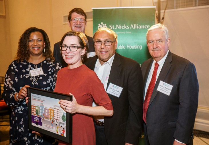 Low Income Investment Fund (LIIF) an honoree at this year’s benefit was represented by Eastern Region Dir. Kirsten Shaw (2nd from left). (l to r) Laura James, St Nicks Alliance Board; Frank Lang, St. Nicks Alliance Dir. of Housing; Phil Caponegro, Conselyea Street Block Association Pres.; and Michael Rochford, St. Nicks Alliance Exec. Dir. presented the award. Photo Credit: Stefano Giovannini