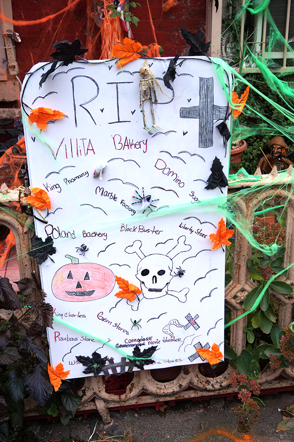 Filmore Place has been possessed by the Halloween spirit. Along both sides of the block, between Driggs Avenue and Havemeyer you can take a walk down memory lane of beloved businesses of North Brooklyn’s past. The loss of Tops is still a stake through many a heart. Recent losses of Rosemary’s Greenpoint Tavern and Mugs Ale House are also represented. Once upon a time there was a Kings Pharmacy, but then Duane Reade moved directly across it Bedford.