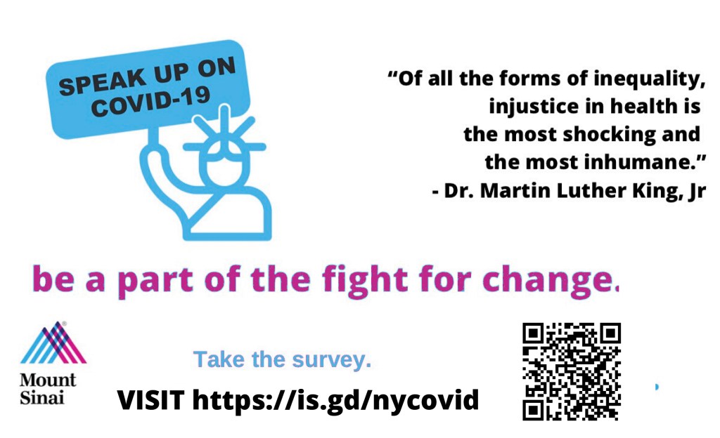 COVID-19 has cast a spotlight on many things, one of them is the subject of health equity. In May of 2020 the Institute for Health Equity Research (IHER) at the Icahn School of Medicine at Mount Sinai was created to “examine the causes and magnitude of health and health care disparities affecting nonwhite, low-income, immigrant, uninsured, LGBTQ+, and other vulnerable populations across all ages, abilities, and genders in order to will devise, test, and implement innovative solutions to eliminate disparities in health while fostering long-term collaborations with community organizations and policymakers,” states the mission statement. Their Speak Up on COVID-19 survey is currently exploring how New Yorkers have been affected by the COVID-19 pandemic.