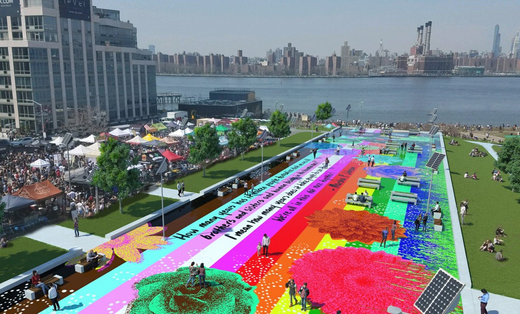 A group of North Brooklyn community members united under the platform of “Stop the Plastic Park” and started an online petition here. “Without action, Marsha P. Johnson State Park will be covered with an acre of plastic. The current permeable pathways in black asphalt. Enormous plastic and foam board flowers will block sight lines and river views!”