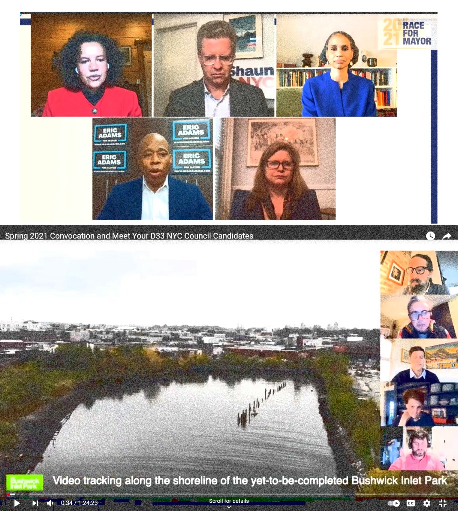 City council candidates for District 33 were hosted by Friends of Bushwick Inlet Park. The first part of the event was reserved for the 3rd Annual Spring Convocation for the Bushwick Inlet Park. A dynamic opening gave you a birds-eye view of the the park and inlet via video drone. The Friends of Bushwick Park filled the following 24 minutes with a brief overview of their advocacy, insight into the current development status of the park, and upcoming events like the 10th Annual Riverkeeper Sweep on May 1st. Then at the 24 minute mark each candidate had three minutes to pitch their platform. Also Congresswoman Carolyn Maloney popped in to give a quick update on recent legislative developments and her work to bring a pop-up COVID-19 vaccination site at Cooper Park Houses.