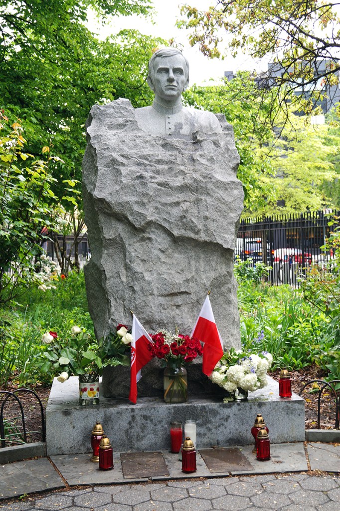 A statue of a beloved Polish priest and freedom fighter, Father Jerzy Popiełuszko, which sits across from McCarren Park was vandalized on May 5. A black plastic bag covered the statue’s head, trash was strewn around its base, and “No Polish” was written on the stone base. Many don’t know that the rough-hewn stone base includes the shape of Poland.