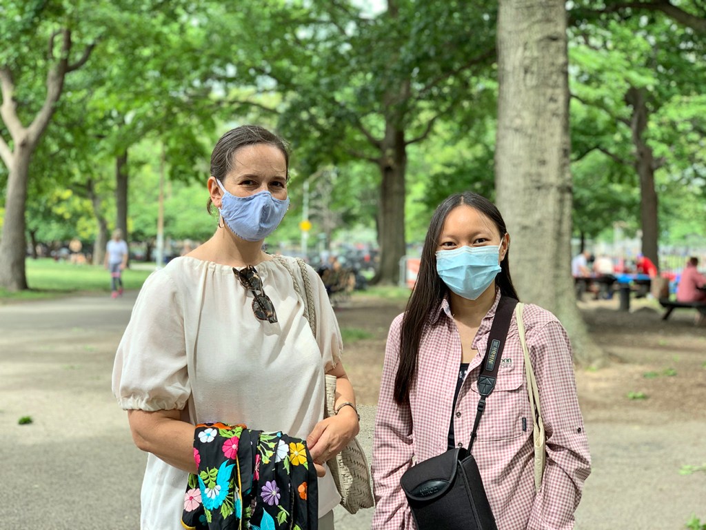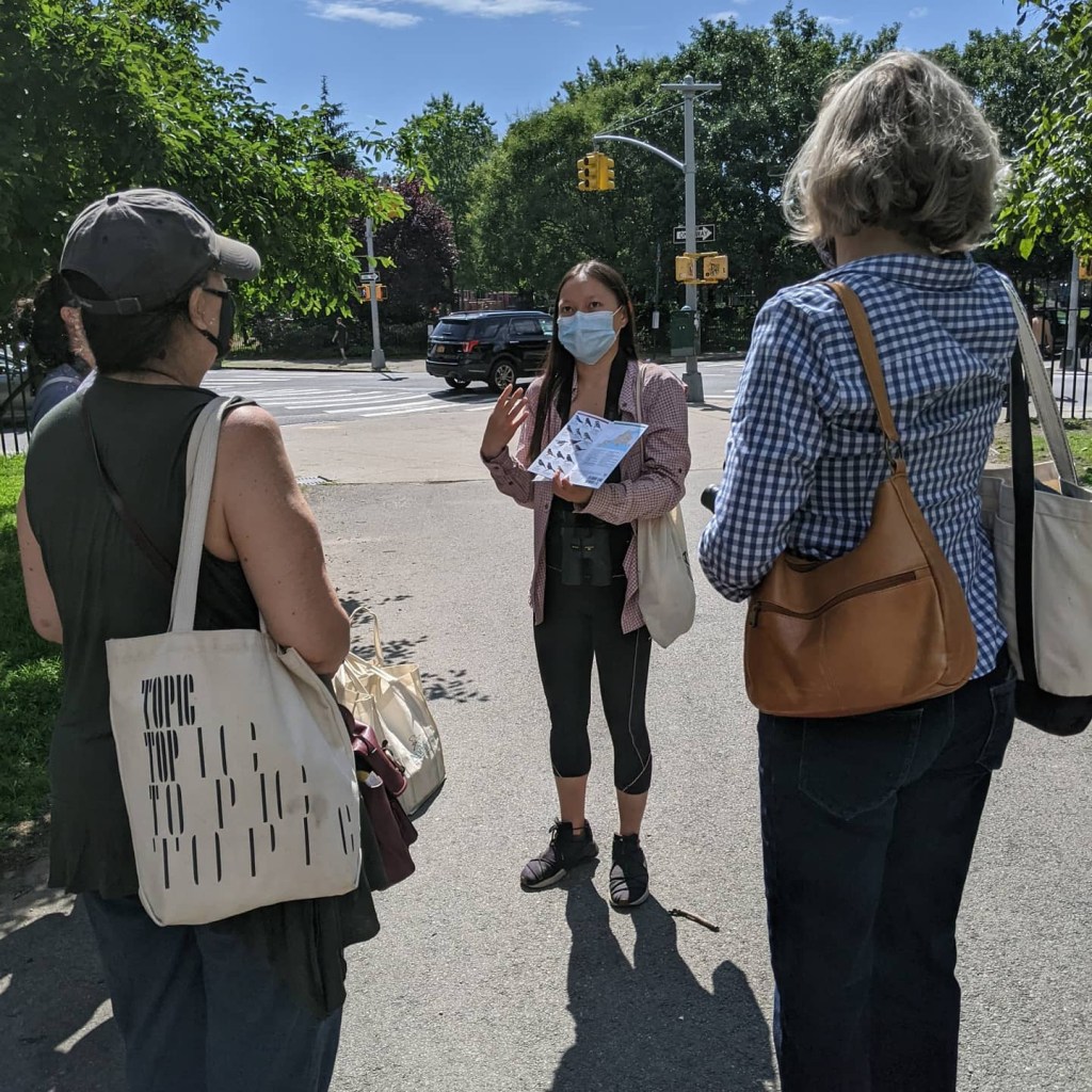 Audubon birding walks returned on June 13. The walks bring you out to Msgr. McGolrick Park early on a weekend morning to see the bird life in that park, in McCarren Park, and that which is found along the way between the two parks. These walks went on hiatus in 2020 due to COVID-19 safety protocols. For the June 13 walk we met at the angel statue (a fittingly winged landmark for meeting up). Lily Lasovic (of NYC Audubon) was the guide and brought binoculars for those who needed them. Acacia Thompson (Greenpoint Library’s Environmental Justice Coordinator) was also present as the organizer of the outing. Highlights of this walk were spotting a nest of Red-tailed Hawks and a fledgling Audubon’s Oriole in McCarren Park. It’s a lovely way to start the day. More birding walks will take place to catch the fall migration.
