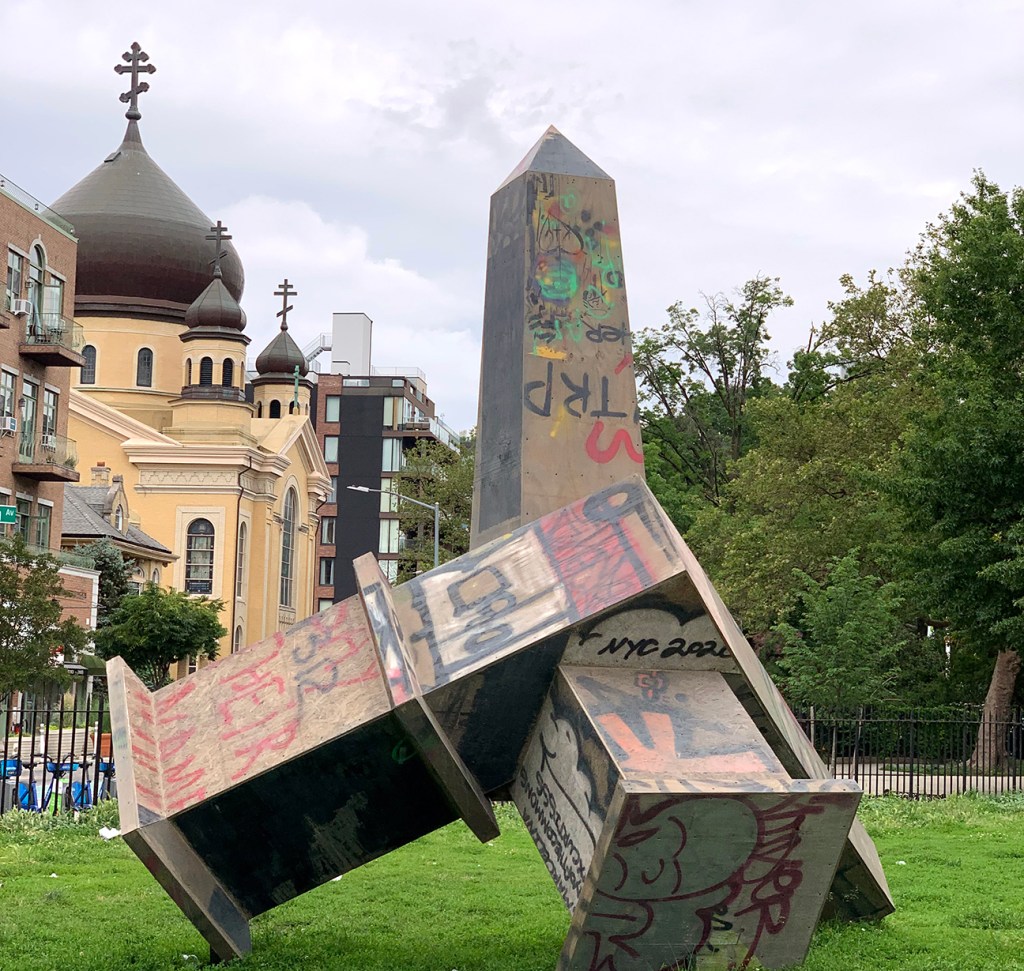 On the southwest side of the track is an art piece called “Miguelito” by Michael Zelehoski as part of the “The Plywood Protection Project” a Worthless Studios production. This public art project repurposed into sculptures the plywood used to cover NYC storefronts during the 2020 protests. There are five sculptures, one in in each borough, and can be viewed from May 15, 2021 – November 1, 2021.