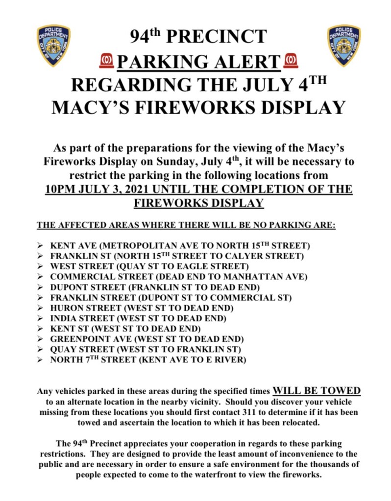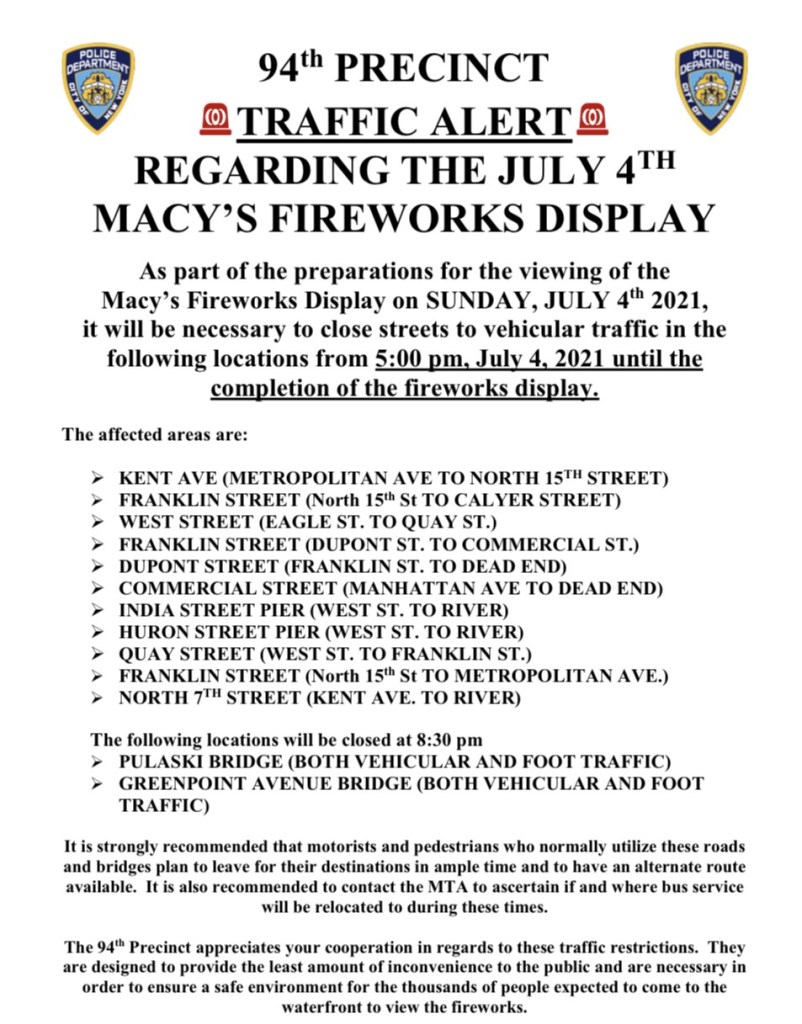 Once again the East River will host barges of fireworks for the Macy’s Fourth of July Fireworks Show. The show is scheduled to begin at 9:25 p.m. In North Brooklyn the best views will be from: Domino Park, Bushwick Inlet Park, East River State Park, and Transmitter Park. If you’d like to watch them from home the guidance is: any area with an unobstructed view of the sky above the East River around the Midtown mark.