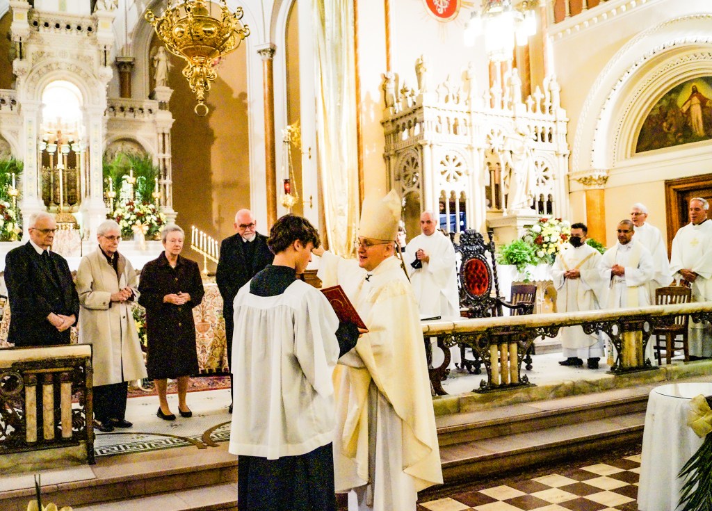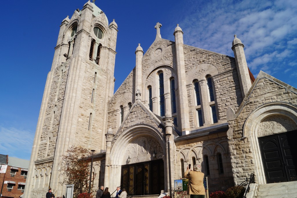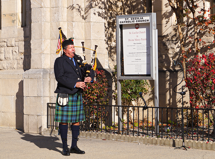 A special mass was held on November 21 to mark St. Cecilia’s 150th anniversary. A bagpiper played outside the steps of the church, a nod to this church’s ancestry. The mass began with a blessing of new chalices by Bishop James Massa. Later when he acknowledged the anniversary he said, “Whenever we celebrate the anniversary of a church we face a certain dilemma. Do we celebrate the building that has remained standing after all these years? Decade after decade? This building has remained standing through waves of immigration, two World Wars, The Great Depression, Civil Rights, The Gulf Wars, 9-11, and the COVID pandemic. Do we simply marvel at the magnificent architecture? Are we here to celebrate a building or do we gather here to honor the people? The people who St. Peter refers to as the living stones that make up the church?”