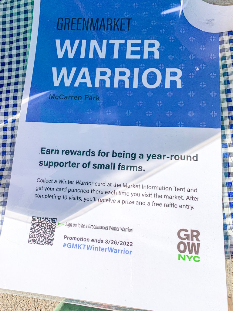 GrowNYC’s McCarren farmers market is a year-round market, but the winter chill can persuade even the most diehard farmers market goer to stay home and stay cozy. To encourage more winter participation at the market, GrowNYC started a Greenmarket Winter Warrior contest in which you visit the GrowNYC info table in any of their farmers markets and are given a card that will be punched for each visit to that market. Once your card is punched ten times you can pick a prize in addition to being entered into a raffle for a bigger prize. No insight as to what the prizes will be this year; in past years prizes for the ten participation punches have been shopping bags, water bottles, etc., but some see the real prize as being the rush of endorphins received from trudging out into the cold and supporting farmers during the hardest months of the year. This year’s contest started January 8 and concludes on March 26, 2022.