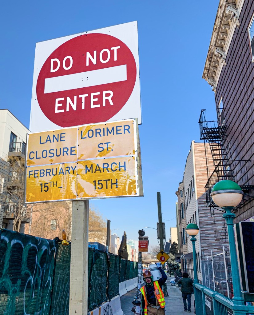 In the past months the sidewalk on Metropolitan between Lorimer and Leonard Streets has been narrowing. Lorimer Street from Metropolitan Avenue to Skillman Avenue has been closed to traffic since the second week of February and is scheduled to continue until the ides of March. Signs on the construction fencing have communicated that (Americans with Disabilities Act) ADA improvements are underway and are to be completed in the third quarter of 2023.