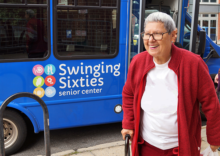 “Coming here in the morning, it’s so helpful to be picked up by the bus. My cardiologist saved my life 13 years ago when I had a heart attack. Since then, I’ve had a stroke and many mini-strokes, although nothing recently, and I’m not steady on my feet. Coming to Swinging Sixties and having meals, where I have a good balance of fruit, vegetables, and good carbs, is very important but so is the socializing,” said Jane Irvine , a longtime member of the center who regularly rides the Swinging Sixties Bus.