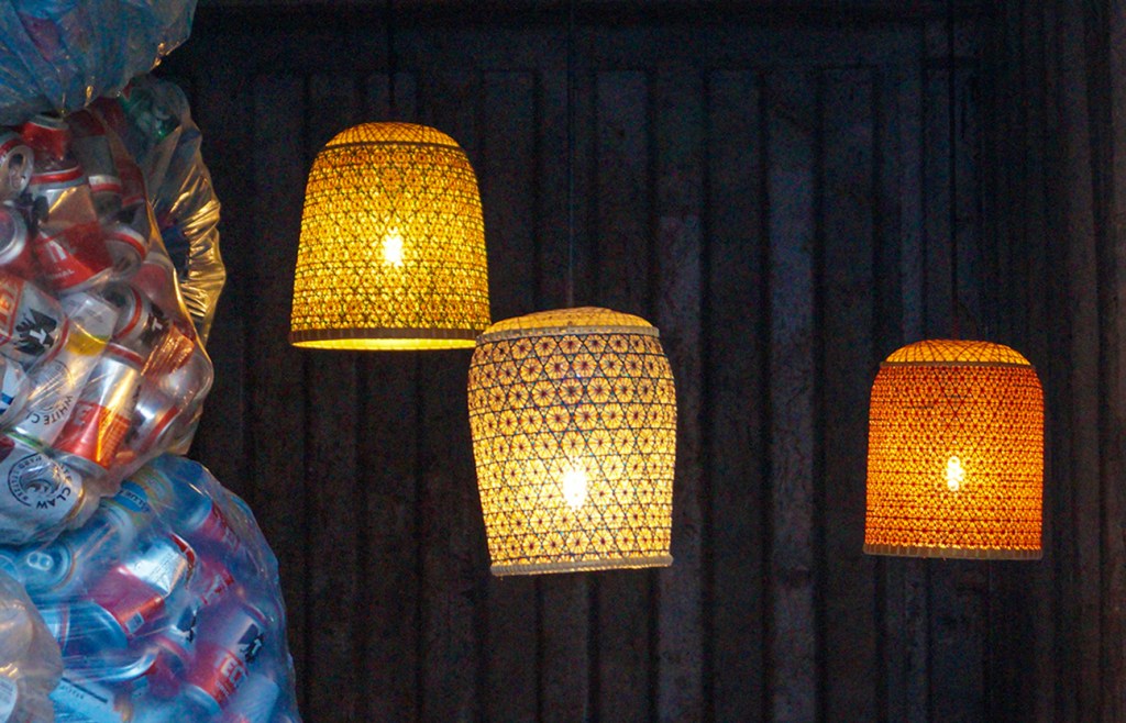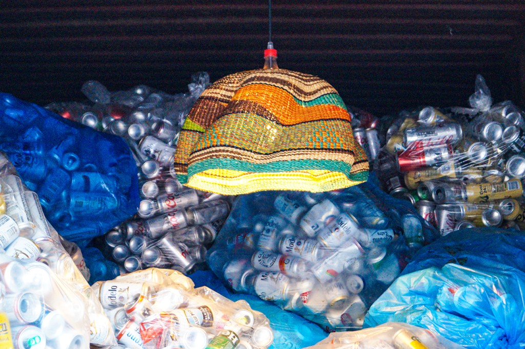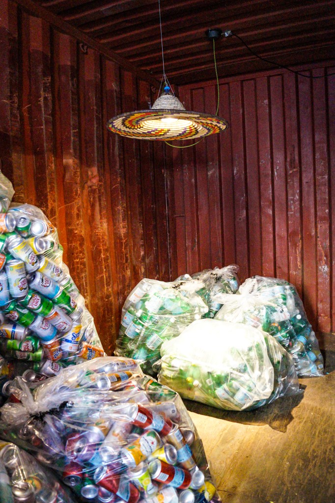 PET Lamp’s design team flew in from Madrid and spent a week curating the exhibit. Placing lamps in shipping containers with bags of collected cans and bottles.