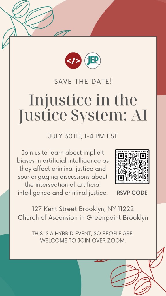 On July 30 you’re invited to join a discussion on how artificial intelligence (AI) is gaming the criminal justice system. The event can be accessed in person at 127 Kent Street (Church of Ascension) and on Zoom. The first two hours will be spent on the panel of experts who will delve into different perspectives of algorithmic justice followed by a Q&A. Afterwards, attendees will have the opportunity to walk around and network with each other and the panelists. The last portion of the event will be a workshop that will include slideshows and discussions that educate others more in depth on algorithmic justice and how to get involved, with a resource packet for further engagement.