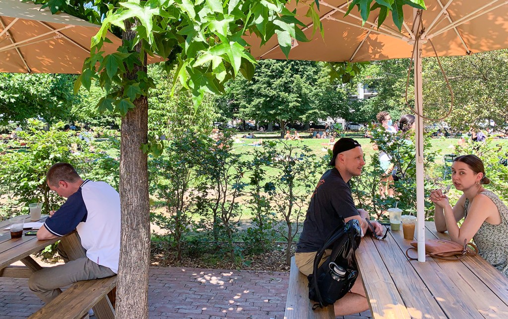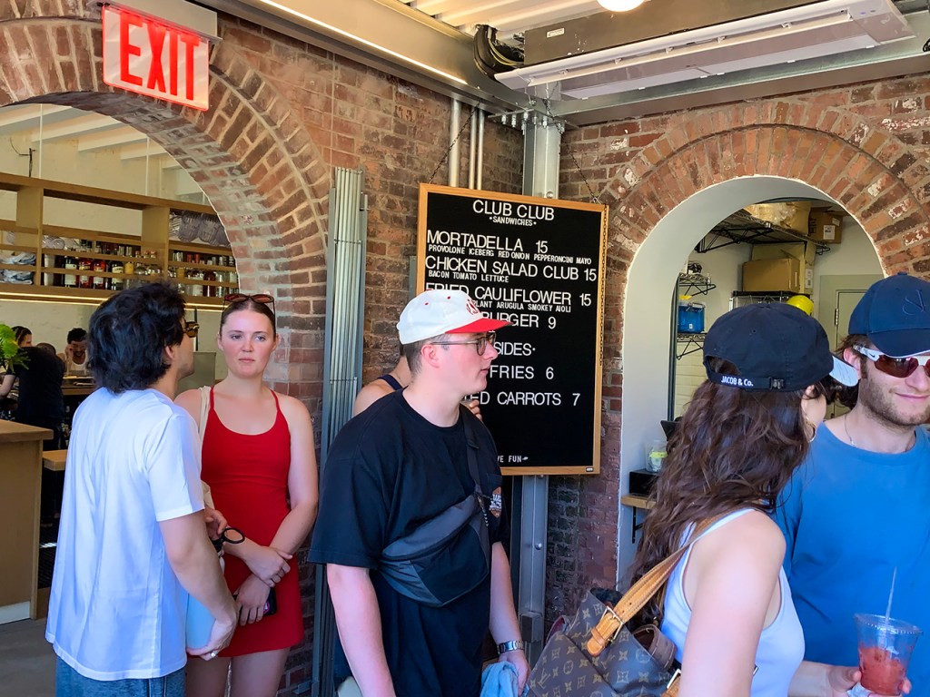 The pandemic slowed the progress of the Park House project, as it has with everything since mid-March 2020. It was originally planned to open in spring 2021. McCarren Park’s Park House opened on June 17, 2022. The southwestern edge of the structure is the entrance to the restrooms, which is an all-gender lineup. Still on the southern side, there is an entrance to the Park Bar at the center — once in you can continue through to the other side which houses: Blank Street coffee, Odd Fellows ice cream, Club Club sandwiches, and a hedged-in patio with umbrellaed picnic tables. There is a break in the hedges to exit to the lawn on the northern side of the Park House. On the weekend of June 25-26, signs out front and back advertised “Your first drink is on us” if you downloaded the Blank Street app. A music group had flyers up advertising they’d be playing in that area. No live music was set up or playing when I passed by. Whether that meant I was too early or too late or that they got the hook due to the no-music rule I do not know.