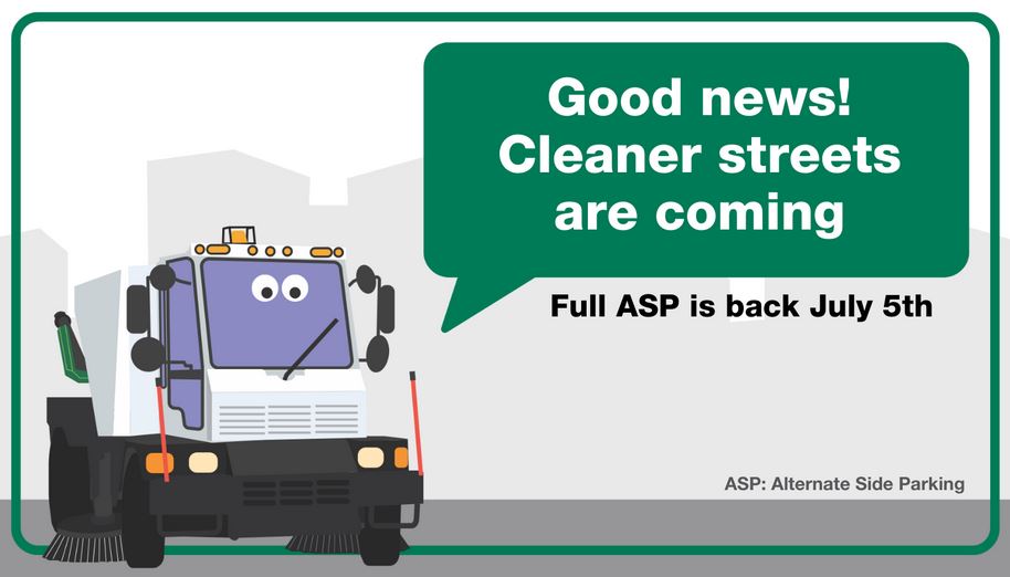 Streetcleaners were on a half schedule and many times had to go around parked cars. Full-schedule alternate side parking (ASP) returned on July 5 to address street trash conditions. “The dirty little secret here is when ASP went to one day a week instead of two in practice it was like having no cleaning in lots of blocks in this city. That’s not for a lack of trying or care from the Sanitation Department. [It was because] too many people saw a once in a while ASP ticket as the cost of doing business,” said NYC Department of Sanitation Commissioner Jessica S. Tisch.
