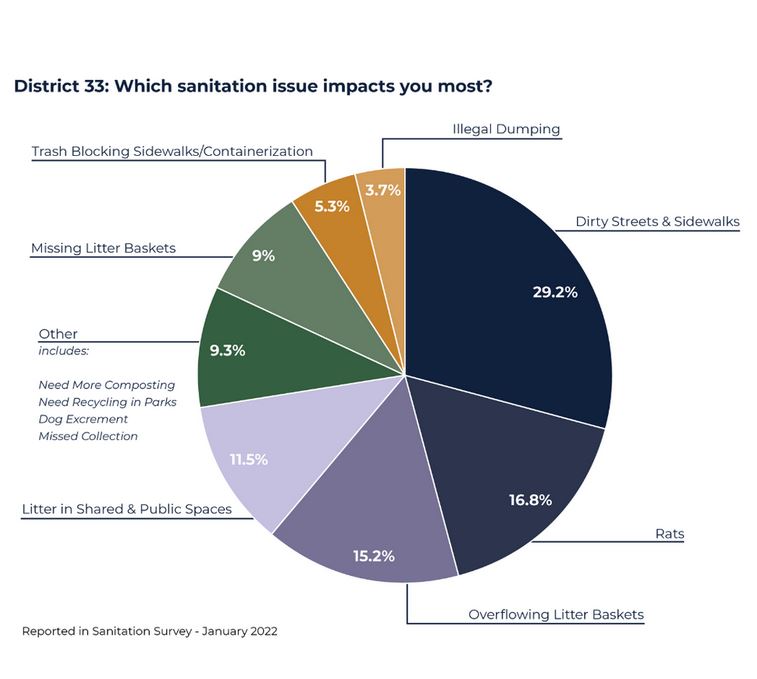 The top three trash concerns revealed by NYCC District 33’s survey are: dirty streets and sidewalks (29.2%), rats (16.8%), and overflowing litter baskets (15.2%). Their community clean up plan will look to address rat conditions through composting for all, purchase new litter baskets (his office funded 25 new rat-proof litter baskets around his district on August 1 and promised more), organized community clean ups (they hold one every other week in a different neighborhood, the next one should happen the first week of September). To see the full plan items, go to: https://www.lincolnrestler.nyc/sanitation-plan
