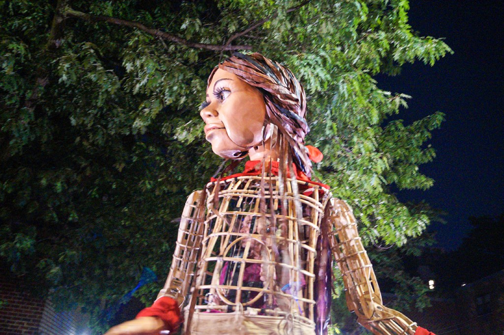 From September 14 to October 2, Little Amal will be making appearances throughout NYC, and will appear in each borough. On the night of September 23, Little Amal walked down Berry Street from North 5th Street to North 1st Street. She was met by El Puente’s Madre Tierra puppet.