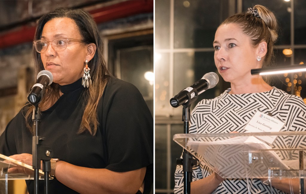 Laura James, vice chair and Lisa Gutting, fundraising chair emceed the presentation of St. Nicks Alliance’s highlights of their work this year.