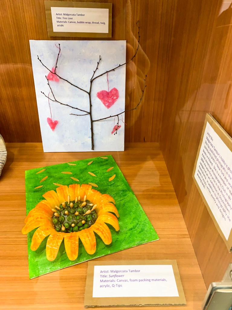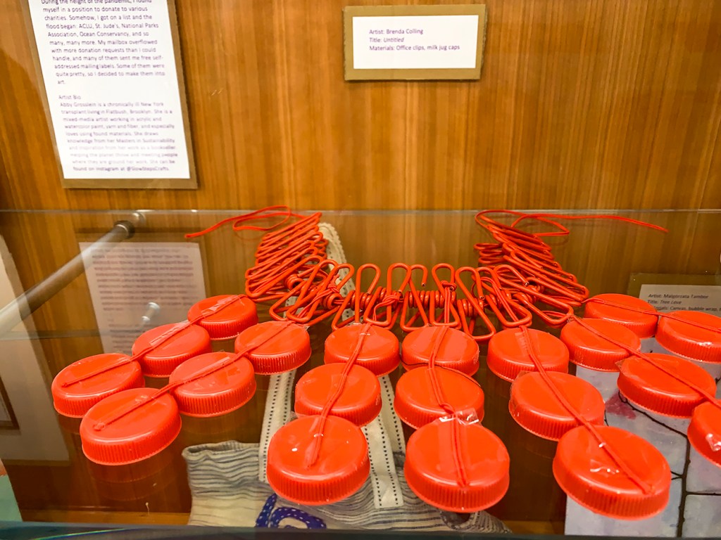 “This exhibition [showcased] the upcycling artistic talent of your fellow patrons. We are celebrating the pursuit of repurposing everyday items into art by sustainable means and processes,” said the event description. It also informed that November 15 is National Recycling Day. The exhibit was easy to find and contained in the glassed-in shelves outside of the Environmental Education Center on the 2nd floor.