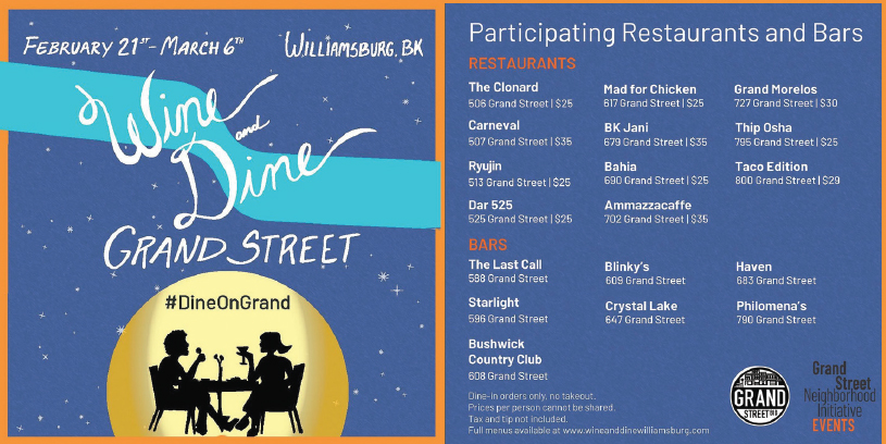 Check out the list of participating restaurants and bars and their offerings here. If you’d like some guidance the Grand Street BID offers their insight in this guide.