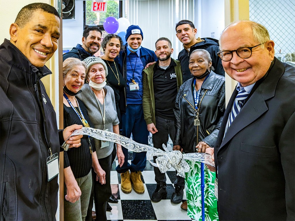 Pictured (l to r) Jose Diaz, maintenance supervisor, St Nicks Alliance; Jose Almonte, CEO, Lavanderia Express; Diana Reyna, founding principal of Diana Reyna Strategic Consulting, also former District 34 NYC Council Member and Dep. Brooklyn Borough President; Alejandro Martinez, superintendent, Jennings Hall; Jose Torres, facilities manager, Lavanderia Express; Christian Almonte, COO, Lavanderia Express; and Richard Fox, managing director for Asset & Property Management at St. Nicks Alliance. Photo credit: St. Nicks Alliance
