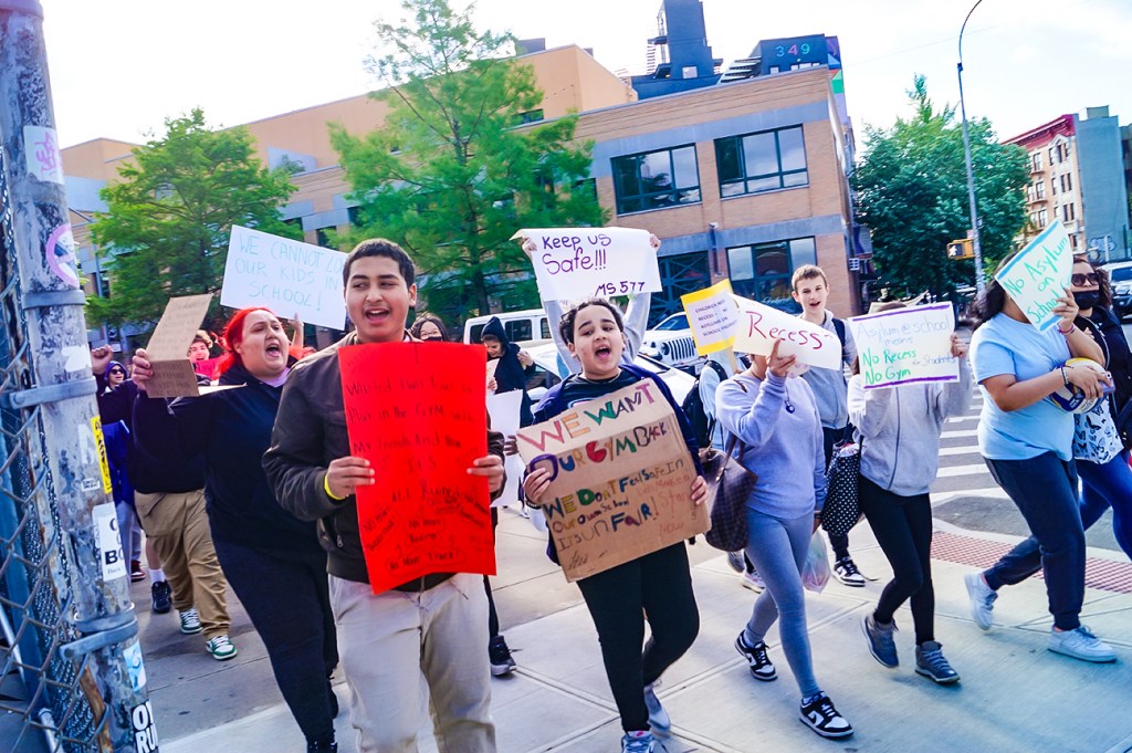 A sign held by one of the M.S. 577 students read, “Waited two years to play in the gym with my friends and now it’s all ruined. No more boxing, no more football, no more track, no more basketball.”