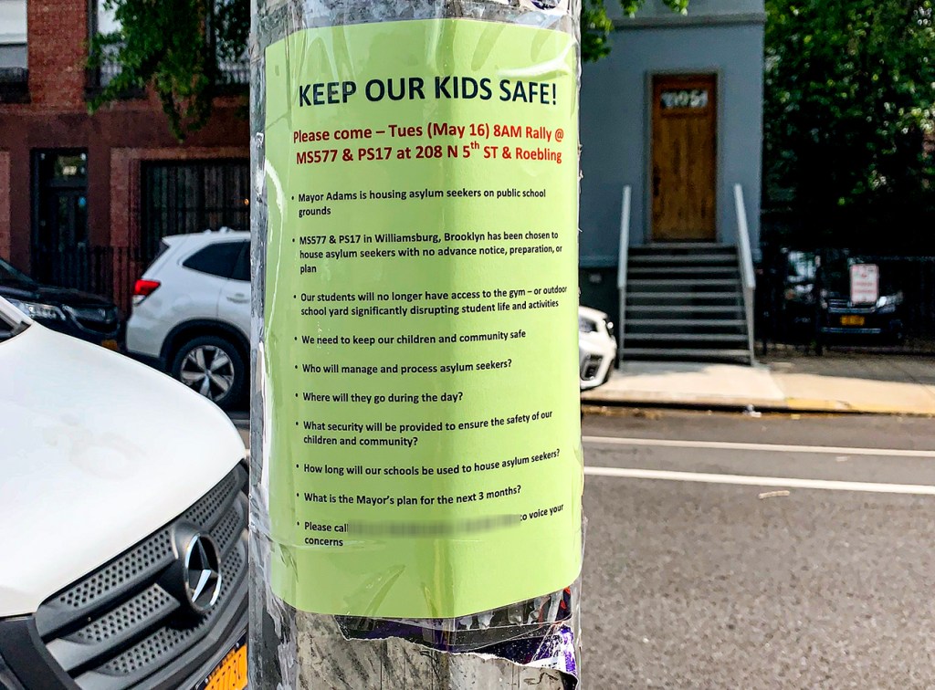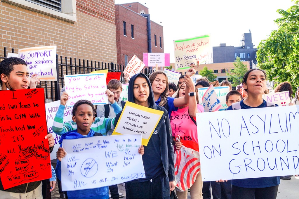 The flyer stated parents were not notified of the gym’s new use, and that this would mean the students would no longer have access to their indoor gym or outdoor schoolyard. It also listed questions: How long would the schools be used for this purpose, what is the Mayor’s plan for the next three months, what security would be provided, etc.?