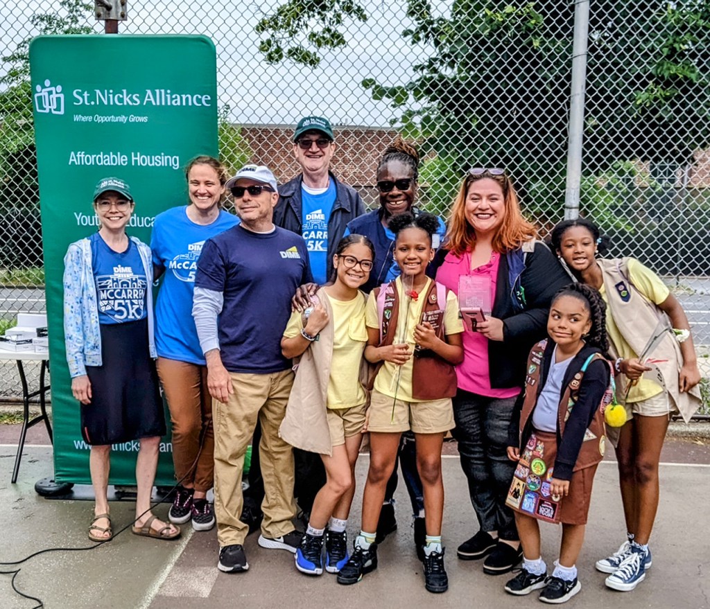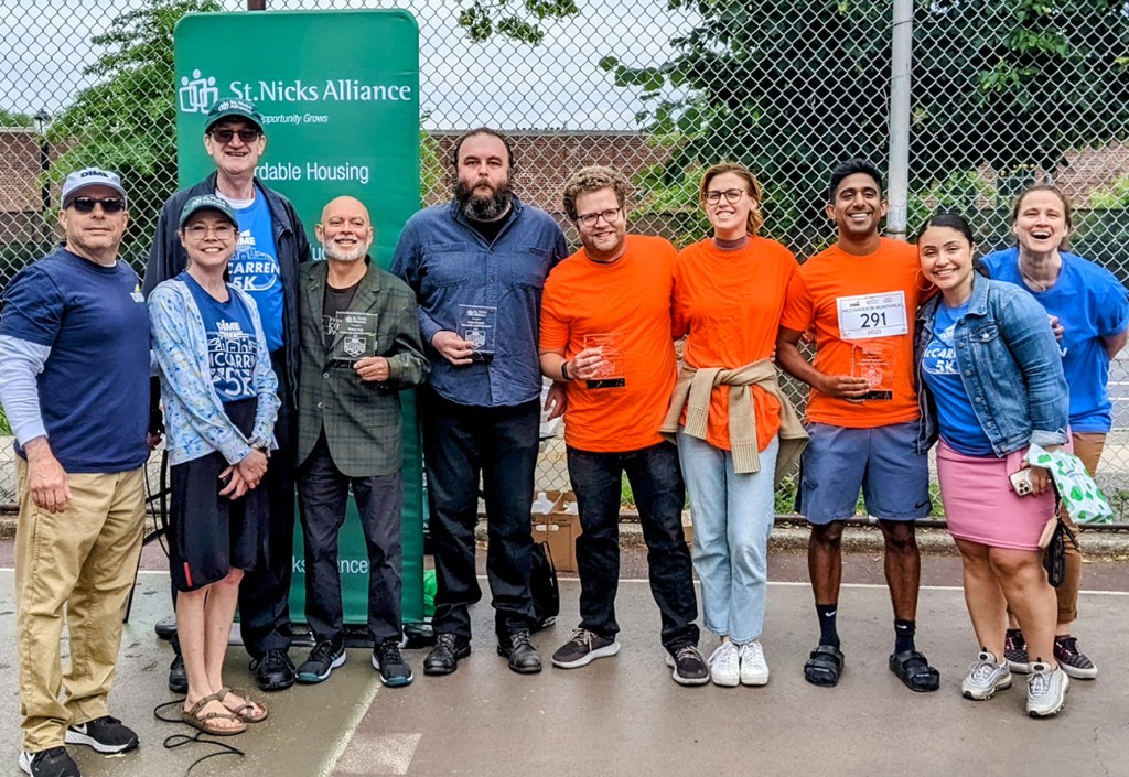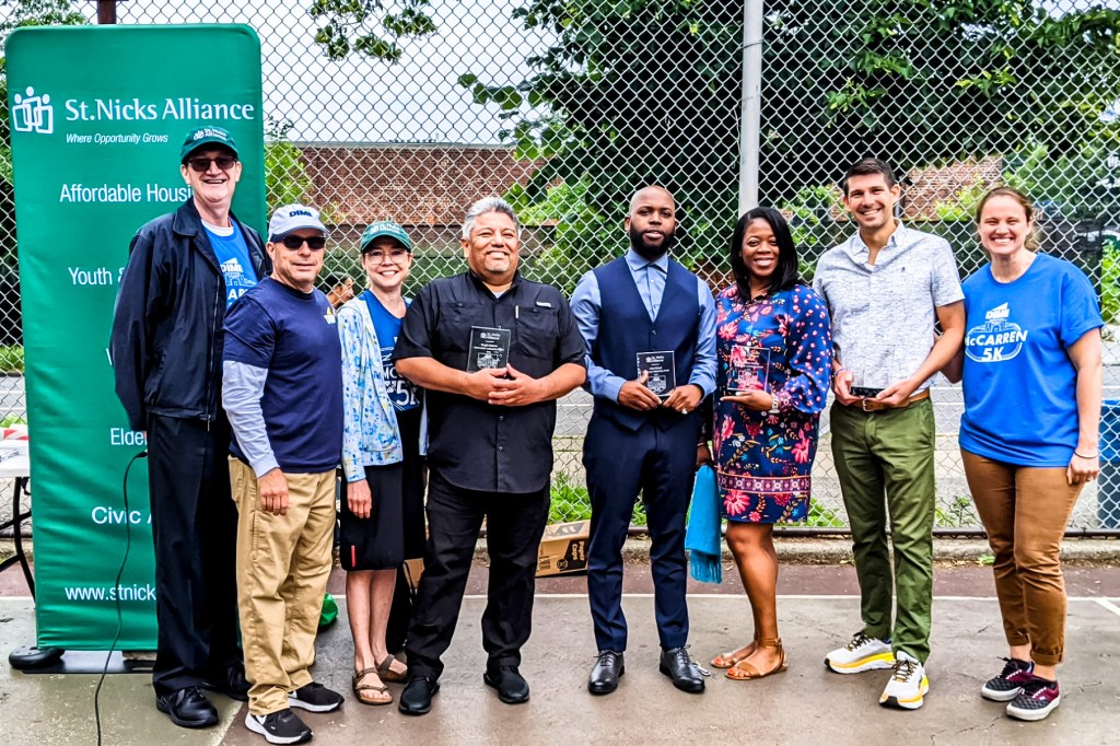 Richard Dodson, first vice president and regional director of Dime Community Bank, co-emceed the event with Michael Rochford, executive director of St. Nicks Alliance. NYC Council Members Lincoln Restler and Jennifer Gutiérrez were present to cheer the runners on and the winners of this year’s civic awards, which were presented by Frank Lang, St. Nicks Alliance’s deputy executive director of housing.