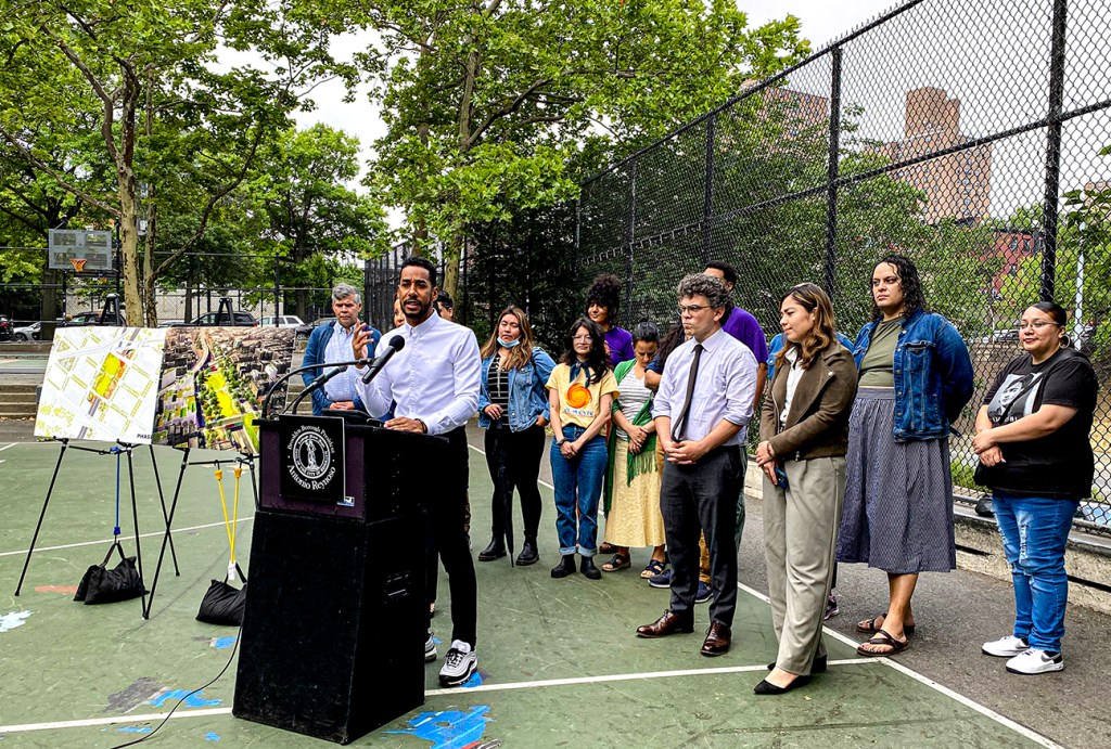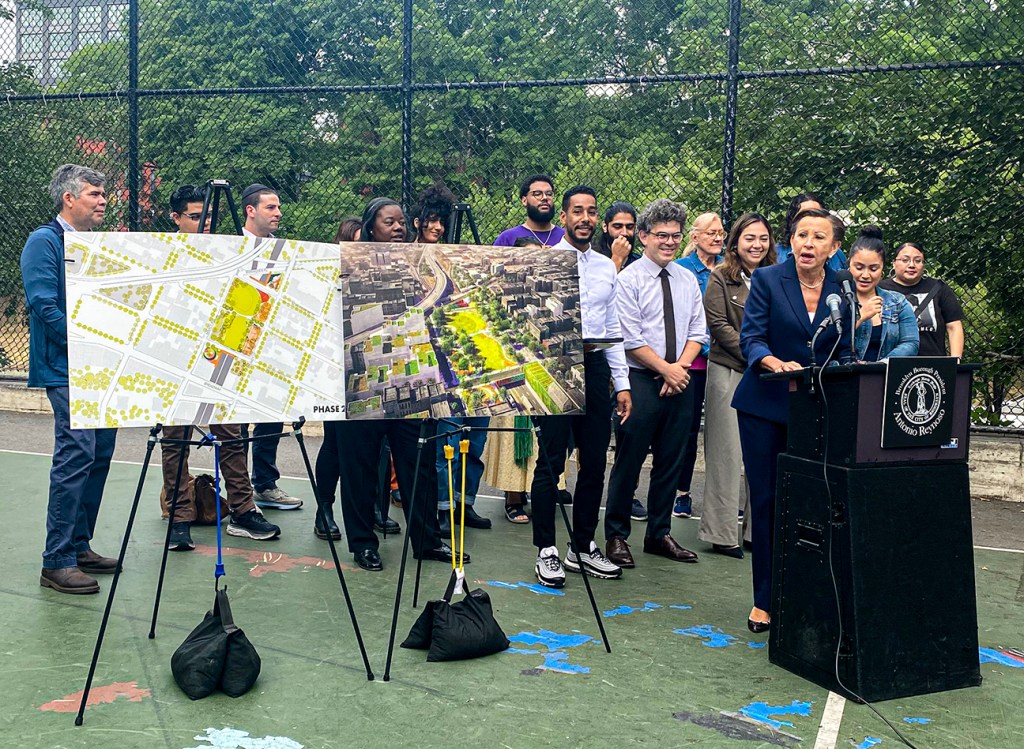 On June 20, Brooklyn Borough President Antonio Reynoso and U.S. Representative Nydia Velázquez were joined by NYC Council Members Lincoln Restler and Jennifer Gutiérrez, NYS Senator Kristen Gonzalez, and community organizations: St. Nicks Alliance, Southside United HDFC – Los Sures, and El Puente called on Governor Kathy Hochul and New York State to advance BQGreen. The expanded park would be outfitted with a flower garden, a playground, a baseball diamond, barbecues, grassy and wooded areas, an indoor pool, and a water play zone.