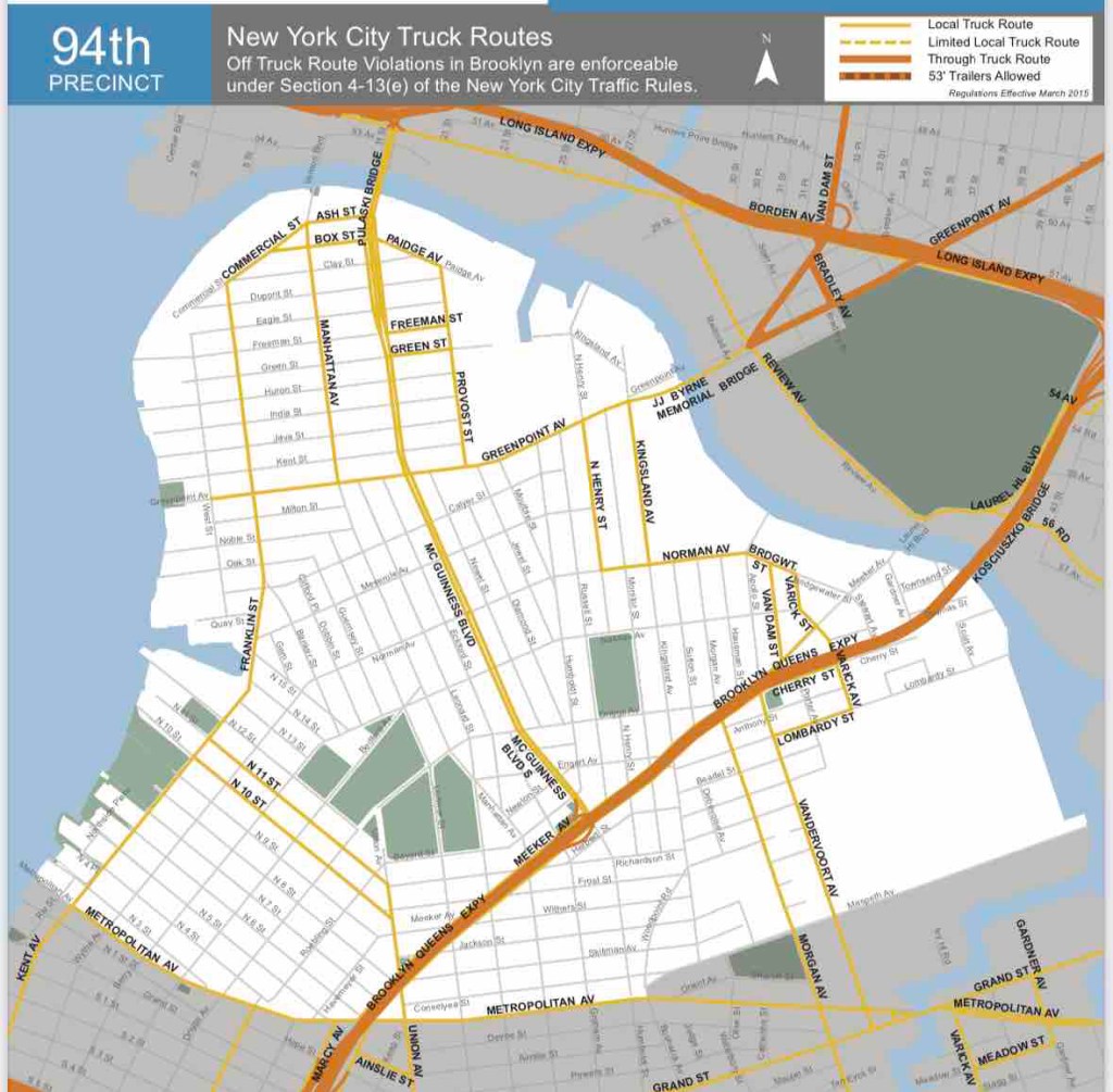 Truck routes within the 94th Precinct span the full length of: Metropolitan Avenue, Franklin Street, Commercial Street, Ash Street, Box Street, Paidge Avenue, Provost Street, Greenpoint Avenue, McGuinness Boulevard, Meeker Avenue, Varick, Van Dam Street, and Vandervoort Avenue.  Partial streets that are truck routes in this sector are: North 10th Street, North 11th Street, Union Avenue, Manhattan Avenue, Freeman Street, Green Street, Cherry Street, Lombardy Street, Bridgewater Street, Morgan Avenue, North Henry Street, and Kingsland Avenue (please refer to the NYC Truck Route map to see where the truck route is on these roads)