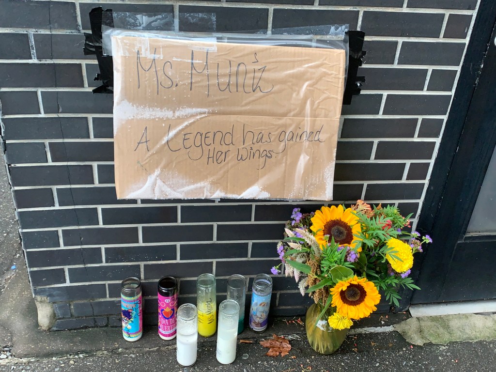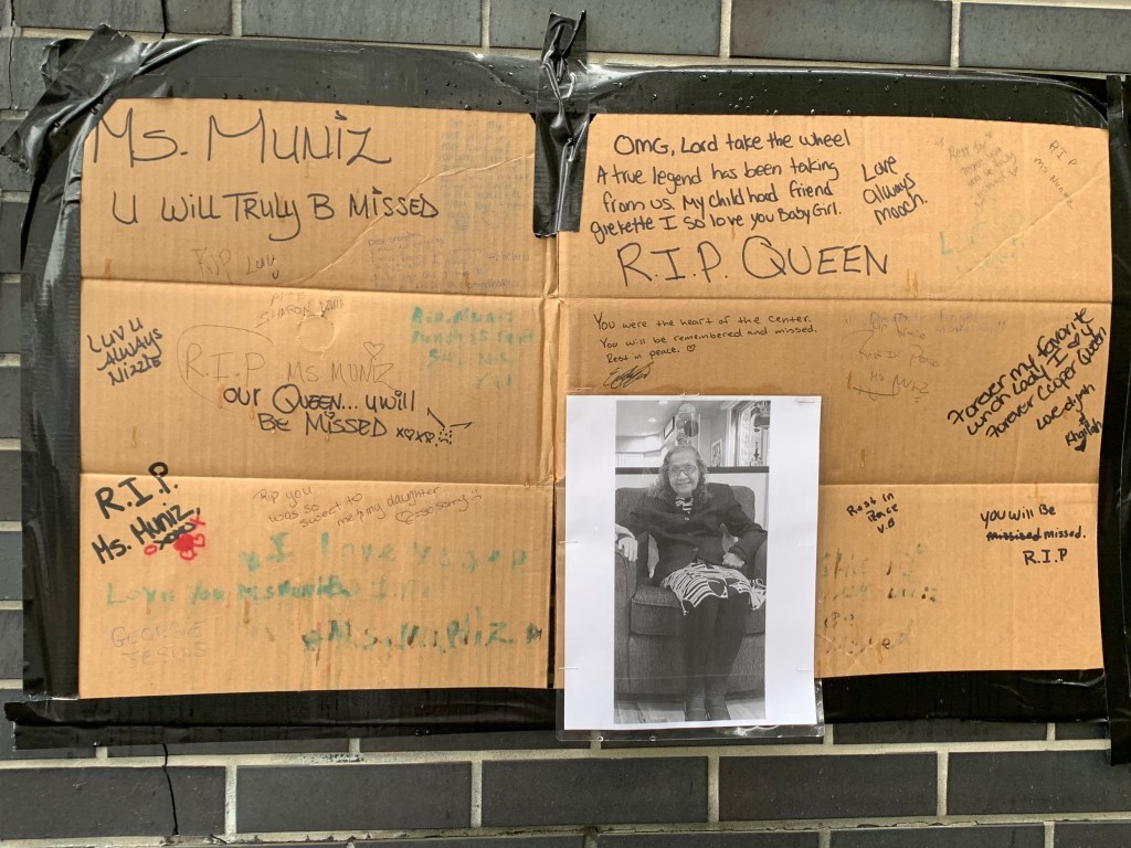 A memorial for Agustina Muniz, placed at the entrance of Cooper Park Houses Community Center, has been collecting tributes. One that has been faded by Friday’s rain says, “Dear Grandma, I miss you every day. I miss your [indecipherable] laugh. I know it’s going to be tough, and I hope to make you proud. Your Grandson”