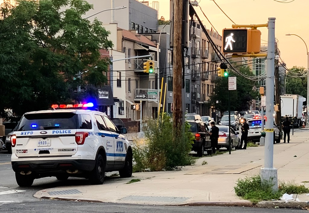 NYPD ‘s 94th Precinct have been monitoring the site of August 21’s fatal hit-and run (Kingsland Avenue and Richardson Street) Here they are  at 7:20 PM on August 22; they were also there the morning of August 23.  Photo credit: Lori Ann Doyon