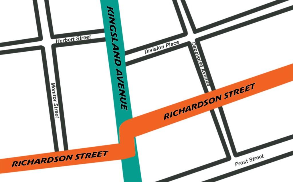 A possible safety issue is that Richardson Street continues around a building at Kingsland Avenue.   Many drivers take a left onto Kingsland and then snake right to continue on Richardson Street. This could take them to Vandervoort Avenue, which is a nearby truck route. Just before 3 p.m. on August 25, a large dump truck made that snake left and right turn right in front of me. In my experience, traffic rarely yields for pedestrians during a turn on or off Kingsland Avenue.