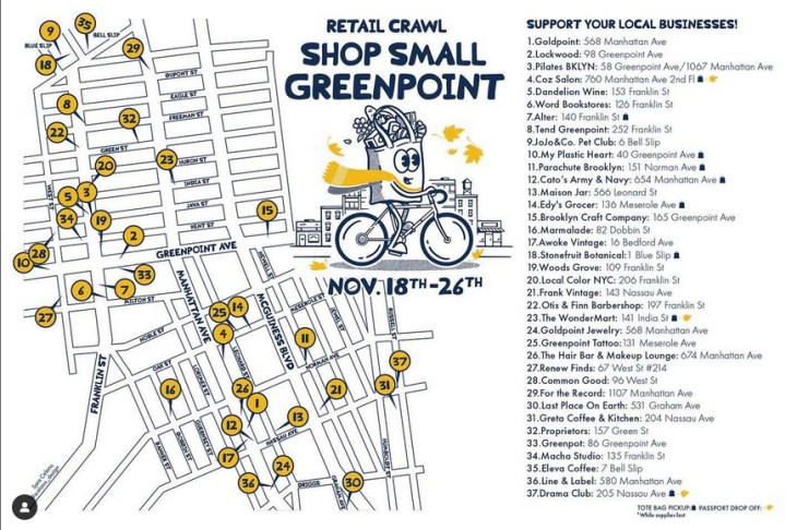 To add some incentive to community shoppers, a group of Greenpoint businesses formed Shop Small Greenpoint in Fall 2022. For a week shoppers shopped specified shops, and if they made the required amount of purchases they received a swag bag. They were also entered into a grand prize drawing if they met the required amount of purchases for that.