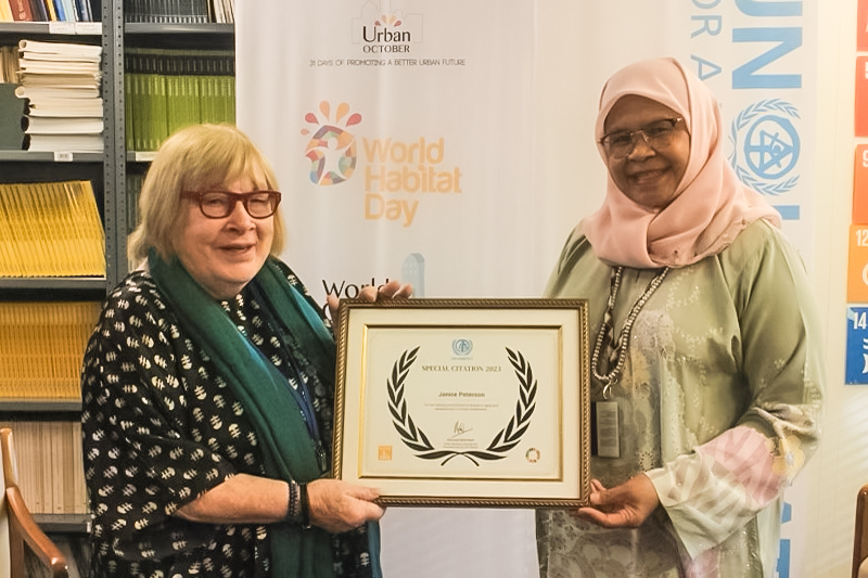 Jan Peterson, the founder of the National Congress of Neighborhood Women and Huairou Commission and North Brooklyn activist for nearly fifty years, was presented an honorary award from the executive director of UN-Habitat, Maimunah Mohd Sharif. Peterson was honored for her decades-long commitment to the work of UN-Habitat on November 19, 2023.