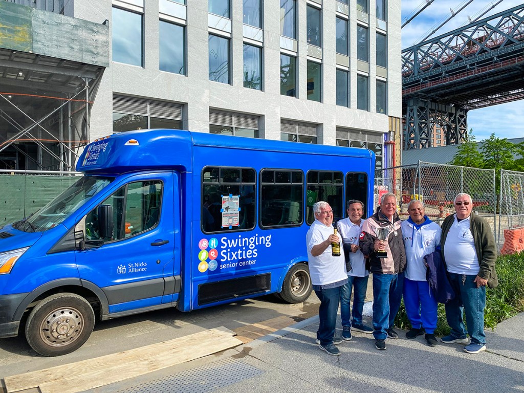 When a shuttle bus was gifted to St. Nicks Alliance for their senior center the cost of maintaining and operating the vehicle became a concern. Conselyea Street Block Association (CSBA) a partner of St. Nicks Alliance and founder of Swinging Sixties thought up the idea of an annual bocce tournament sponsored by local businesses as a fun way to raise money and build community. The first two years the tournament was held at the bocce courts in the basement of the Swinging Sixties center. The third year the tournament was held at two venues: Swinging Sixties and Domino Park. In 2020, the tournament was put on pause due to COVID, and it returned in September of 2021 to be hosted solely at Domino Park’s bocce courts ever since.