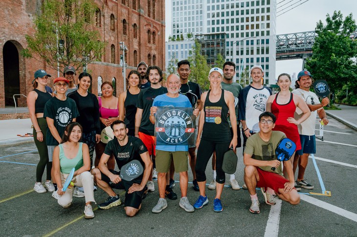 Local pickleball groups, Williamsburg Pickleball, the McCarren Park Hawks, and Brooklyn Aces played a pop-up game at Domino Park on July 17.