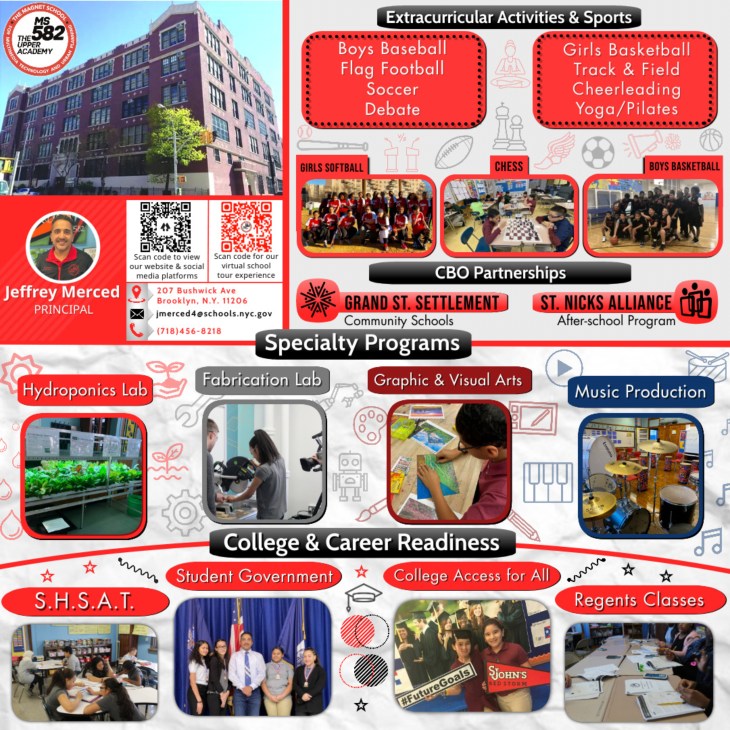 M.S. 582, The Magnet School for Multimedia Technology and Urban Planning, located in East Williamsburg, New York, serves students from grades 6 to 8. Our educational philosophy is grounded in the concepts of experience, exposure, and discovery, and we are dedicated to creating opportunities for our students to engage in these areas meaningfully.