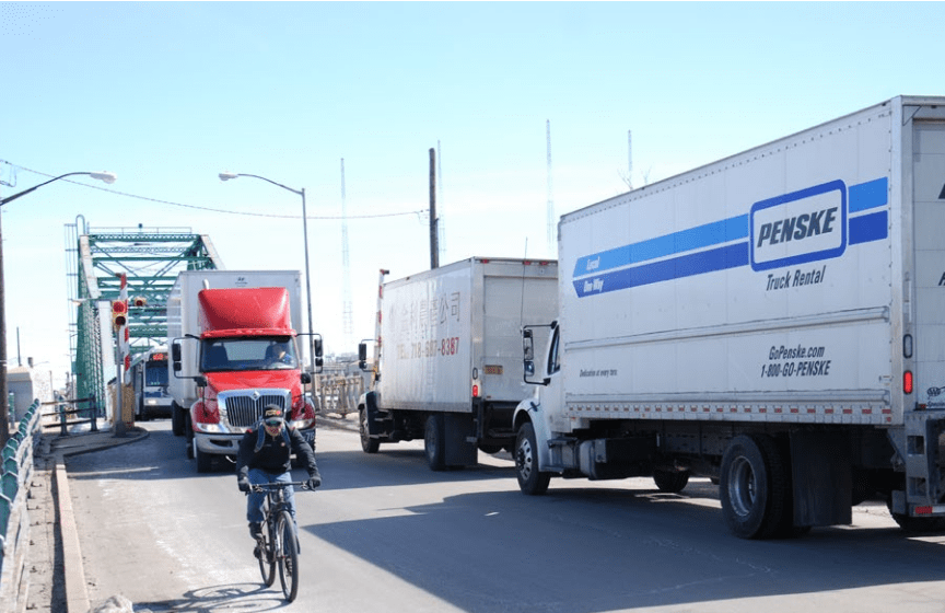 The current state of the bridge is traversed by two-way vehicular traffic, often trucks and busses. There is a narrow space bordered by the truss and the edge rail, not the safest clearance for cyclists or pedestrians.