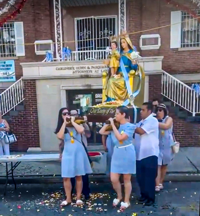 Our Lady of Snow was founded in 1888 to help support the influx of immigrants arriving in Brooklyn from the town of Sanza, Provence of Salerno, Italy. The Feast of Our Lady of the Snow (July 27–August 5) culminates in a celebration of Santa Maria of the Snows’ feast day (August 5). 2025 marks the 137th annual feast in Williamsburg.