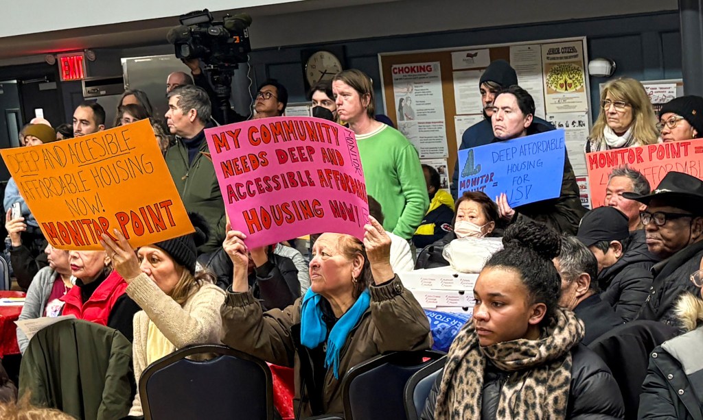 On one side of the room, dozens gather and raise their voices—they demand deeply affordable and accessible housing, holding signs in clear support.