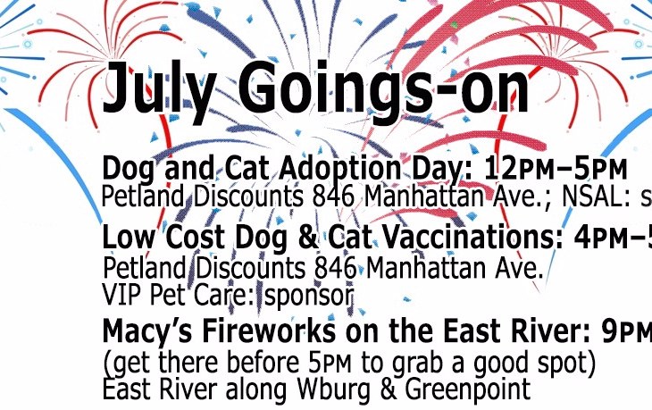 Local Events Image July Goings-On by The Greenline Posted on July 1, 2017July 10, 2017 07.02 Dog and Cat Adoption Day: 12pm–5pm Petland Discounts 846… Read More