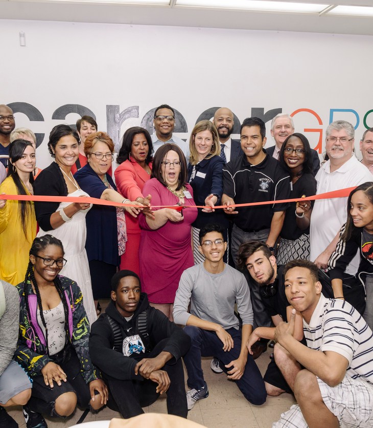 Principals and students of the Grand St. Campus, led by Principal Rosemary Vega of School…